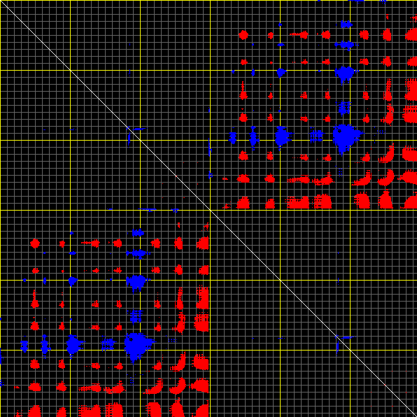 This matrix displays the maximum distance fluctuations between all pairs of CA atoms and between the two extreme conformations that were computed for this mode (DQMIN/DQMAX). Distance increases are plotted in blue and decreases in red for the strongest 10% of the residue pair distance changes. Every pixel corresponds to a single residue. Grey lines are drawn every 10 residues, yellow lines every 100 residues (counting from the upper left corner).