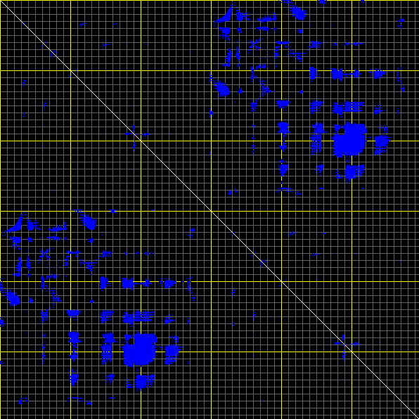 This matrix displays the maximum distance fluctuations between all pairs of CA atoms and between the two extreme conformations that were computed for this mode (DQMIN/DQMAX). Distance increases are plotted in blue and decreases in red for the strongest 10% of the residue pair distance changes. Every pixel corresponds to a single residue. Grey lines are drawn every 10 residues, yellow lines every 100 residues (counting from the upper left corner).