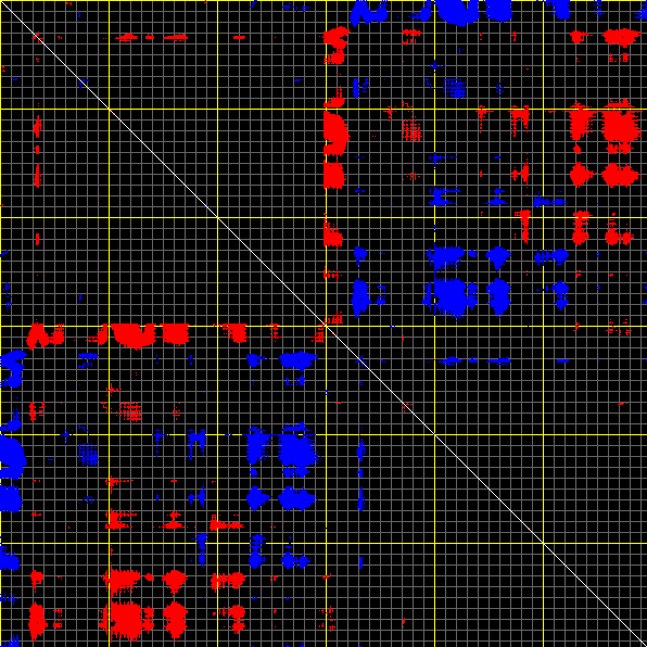 This matrix displays the maximum distance fluctuations between all pairs of CA atoms and between the two extreme conformations that were computed for this mode (DQMIN/DQMAX). Distance increases are plotted in blue and decreases in red for the strongest 10% of the residue pair distance changes. Every pixel corresponds to a single residue. Grey lines are drawn every 10 residues, yellow lines every 100 residues (counting from the upper left corner).
