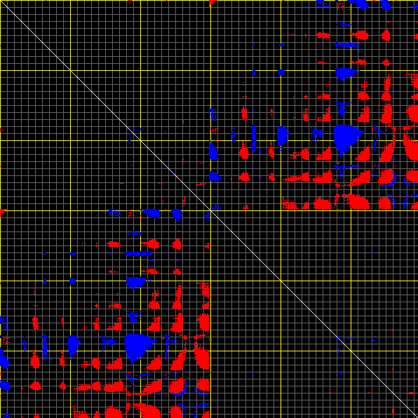 This matrix displays the maximum distance fluctuations between all pairs of CA atoms and between the two extreme conformations that were computed for this mode (DQMIN/DQMAX). Distance increases are plotted in blue and decreases in red for the strongest 10% of the residue pair distance changes. Every pixel corresponds to a single residue. Grey lines are drawn every 10 residues, yellow lines every 100 residues (counting from the upper left corner).