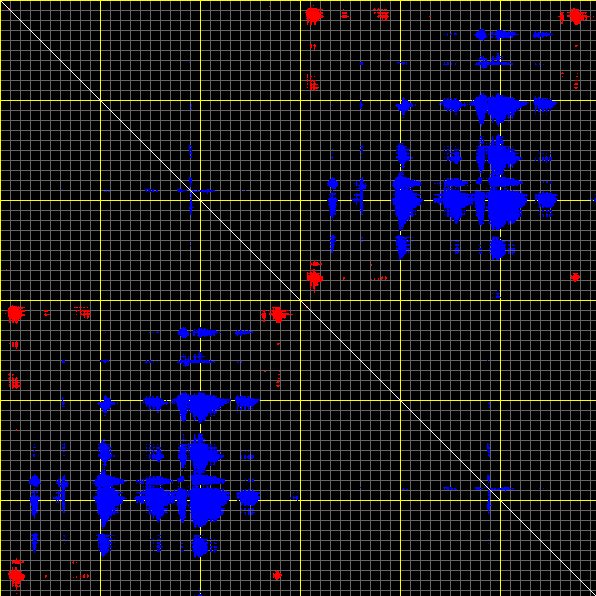 This matrix displays the maximum distance fluctuations between all pairs of CA atoms and between the two extreme conformations that were computed for this mode (DQMIN/DQMAX). Distance increases are plotted in blue and decreases in red for the strongest 10% of the residue pair distance changes. Every pixel corresponds to a single residue. Grey lines are drawn every 10 residues, yellow lines every 100 residues (counting from the upper left corner).
