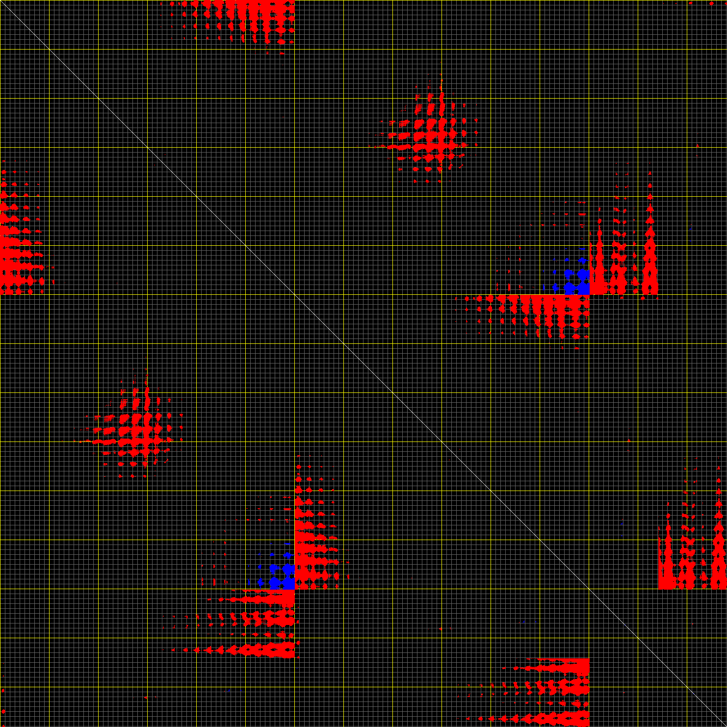 This matrix displays the maximum distance fluctuations between all pairs of CA atoms and between the two extreme conformations that were computed for this mode (DQMIN/DQMAX). Distance increases are plotted in blue and decreases in red for the strongest 10% of the residue pair distance changes. Every pixel corresponds to a single residue. Grey lines are drawn every 10 residues, yellow lines every 100 residues (counting from the upper left corner).
