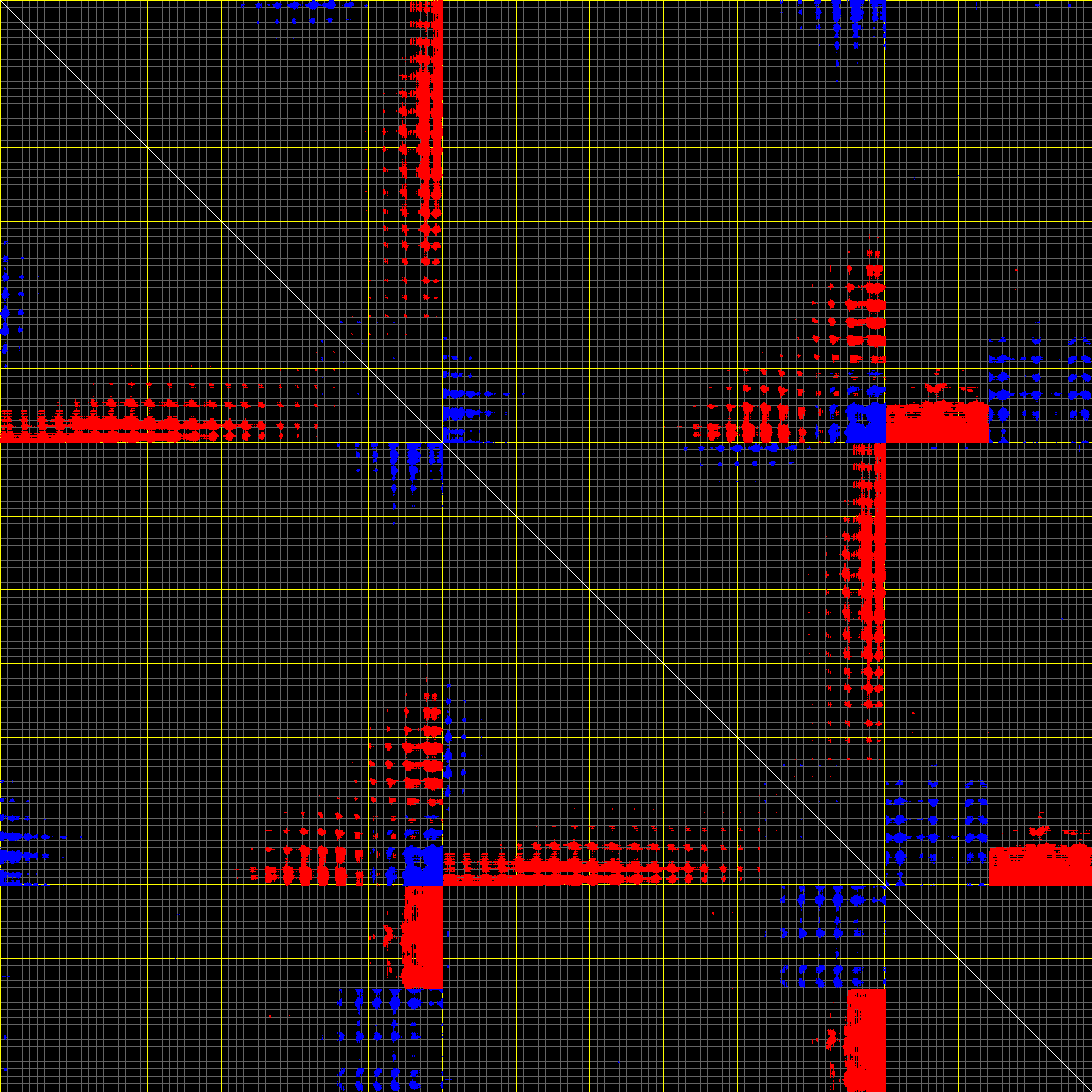 This matrix displays the maximum distance fluctuations between all pairs of CA atoms and between the two extreme conformations that were computed for this mode (DQMIN/DQMAX). Distance increases are plotted in blue and decreases in red for the strongest 10% of the residue pair distance changes. Every pixel corresponds to a single residue. Grey lines are drawn every 10 residues, yellow lines every 100 residues (counting from the upper left corner).