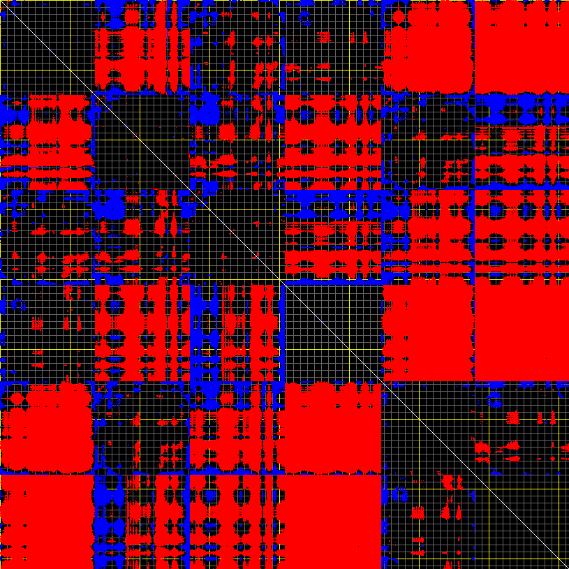 This matrix displays the maximum distance fluctuations between all pairs of CA atoms and between the two extreme conformations that were computed for this mode (DQMIN/DQMAX). Distance increases are plotted in blue and decreases in red for the strongest 10% of the residue pair distance changes. Every pixel corresponds to a single residue. Grey lines are drawn every 10 residues, yellow lines every 100 residues (counting from the upper left corner).