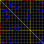 This matrix displays the maximum distance fluctuations between all pairs of CA atoms and between the two extreme conformations that were computed for this mode (DQMIN/DQMAX). Distance increases are plotted in blue and decreases in red for the strongest 10% of the residue pair distance changes. Every pixel corresponds to a single residue. Grey lines are drawn every 10 residues, yellow lines every 100 residues (counting from the upper left corner).