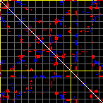 This matrix displays the maximum distance fluctuations between all pairs of CA atoms and between the two extreme conformations that were computed for this mode (DQMIN/DQMAX). Distance increases are plotted in blue and decreases in red for the strongest 10% of the residue pair distance changes. Every pixel corresponds to a single residue. Grey lines are drawn every 10 residues, yellow lines every 100 residues (counting from the upper left corner).