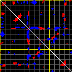 This matrix displays the maximum distance fluctuations between all pairs of CA atoms and between the two extreme conformations that were computed for this mode (DQMIN/DQMAX). Distance increases are plotted in blue and decreases in red for the strongest 10% of the residue pair distance changes. Every pixel corresponds to a single residue. Grey lines are drawn every 10 residues, yellow lines every 100 residues (counting from the upper left corner).