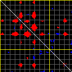 This matrix displays the maximum distance fluctuations between all pairs of CA atoms and between the two extreme conformations that were computed for this mode (DQMIN/DQMAX). Distance increases are plotted in blue and decreases in red for the strongest 10% of the residue pair distance changes. Every pixel corresponds to a single residue. Grey lines are drawn every 10 residues, yellow lines every 100 residues (counting from the upper left corner).