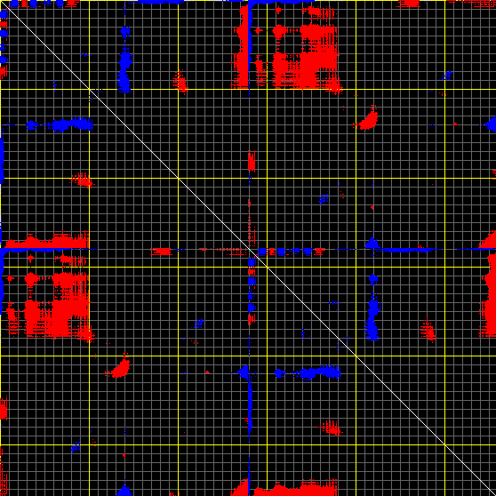 This matrix displays the maximum distance fluctuations between all pairs of CA atoms and between the two extreme conformations that were computed for this mode (DQMIN/DQMAX). Distance increases are plotted in blue and decreases in red for the strongest 10% of the residue pair distance changes. Every pixel corresponds to a single residue. Grey lines are drawn every 10 residues, yellow lines every 100 residues (counting from the upper left corner).