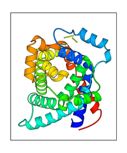 These views are prepared from three orthologuous viewpoints with MolScript. Secondary structures are determined from the C-alpha atom positions of your protein (N-terminal blue, C-terminal red).