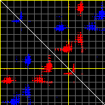 This matrix displays the maximum distance fluctuations between all pairs of CA atoms and between the two extreme conformations that were computed for this mode (DQMIN/DQMAX). Distance increases are plotted in blue and decreases in red for the strongest 10% of the residue pair distance changes. Every pixel corresponds to a single residue. Grey lines are drawn every 10 residues, yellow lines every 100 residues (counting from the upper left corner).