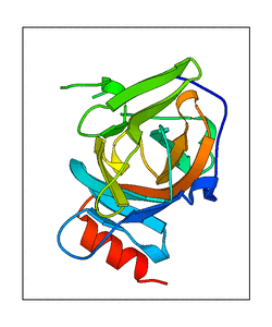 These views are prepared from three orthologuous viewpoints with MolScript. Secondary structures are determined from the C-alpha atom positions of your protein (N-terminal blue, C-terminal red).