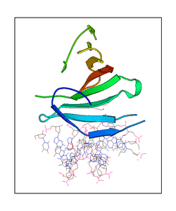 These views are prepared from three orthologuous viewpoints with MolScript. Secondary structures are determined from the C-alpha atom positions of your protein (N-terminal blue, C-terminal red).