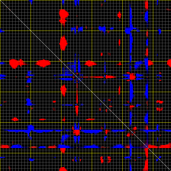 This matrix displays the maximum distance fluctuations between all pairs of CA atoms and between the two extreme conformations that were computed for this mode (DQMIN/DQMAX). Distance increases are plotted in blue and decreases in red for the strongest 10% of the residue pair distance changes. Every pixel corresponds to a single residue. Grey lines are drawn every 10 residues, yellow lines every 100 residues (counting from the upper left corner).