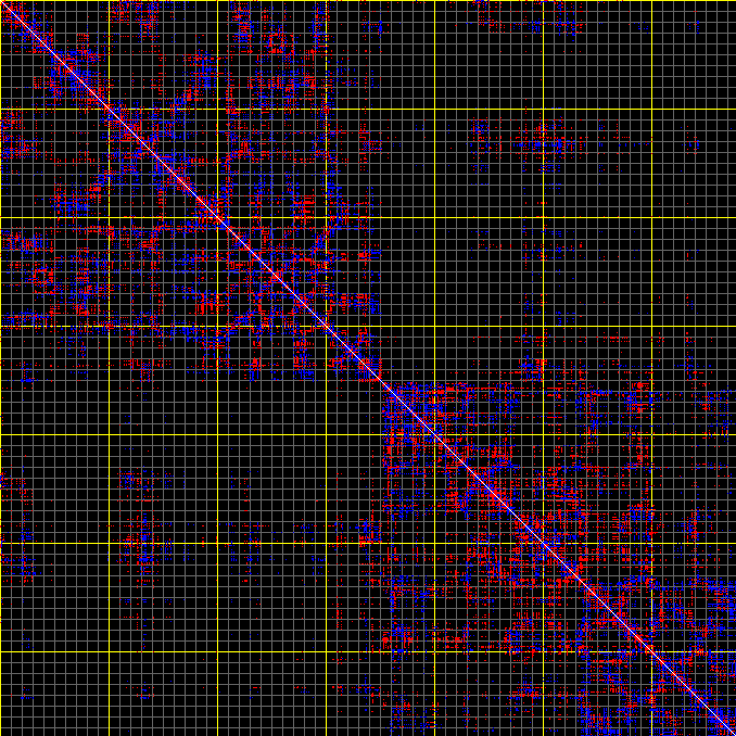 This matrix displays the maximum distance fluctuations between all pairs of CA atoms and between the two extreme conformations that were computed for this mode (DQMIN/DQMAX). Distance increases are plotted in blue and decreases in red for the strongest 10% of the residue pair distance changes. Every pixel corresponds to a single residue. Grey lines are drawn every 10 residues, yellow lines every 100 residues (counting from the upper left corner).