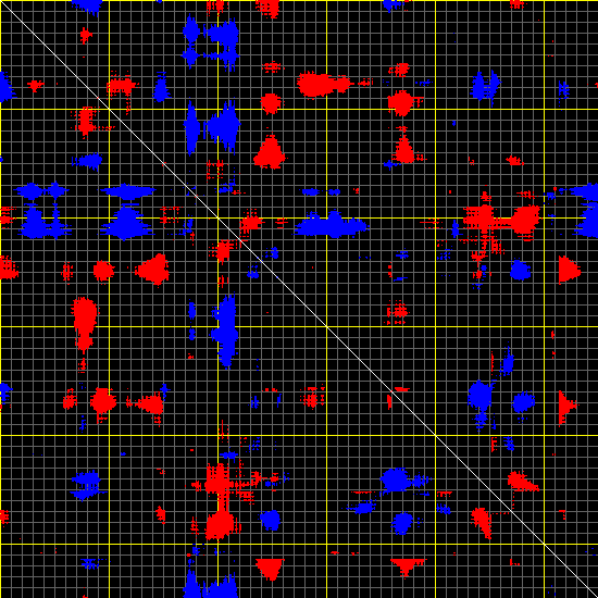 This matrix displays the maximum distance fluctuations between all pairs of CA atoms and between the two extreme conformations that were computed for this mode (DQMIN/DQMAX). Distance increases are plotted in blue and decreases in red for the strongest 10% of the residue pair distance changes. Every pixel corresponds to a single residue. Grey lines are drawn every 10 residues, yellow lines every 100 residues (counting from the upper left corner).
