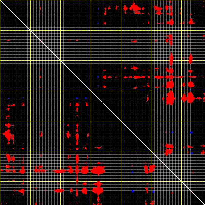 This matrix displays the maximum distance fluctuations between all pairs of CA atoms and between the two extreme conformations that were computed for this mode (DQMIN/DQMAX). Distance increases are plotted in blue and decreases in red for the strongest 10% of the residue pair distance changes. Every pixel corresponds to a single residue. Grey lines are drawn every 10 residues, yellow lines every 100 residues (counting from the upper left corner).