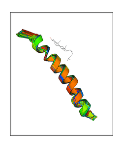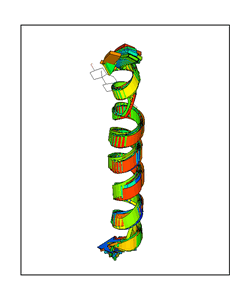 CAUTION: The amplitude range presented in these views corresponds to the highest (DQMAX) and lowest (DQMIN) perturbations chosen for this mode. Secondary structures can break down (and thus disappear from the animation) if the applied amplitudes are too large for Molscript to identify them. The choice of the amplitude is not a NMA result, but has to be done by the user on physical grounds. To change the amplitude range, you can recompute the animation of the desired mode by using the "Compute additional perturbed models with elNémo" section on the results page of your job.
