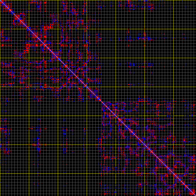 This matrix displays the maximum distance fluctuations between all pairs of CA atoms and between the two extreme conformations that were computed for this mode (DQMIN/DQMAX). Distance increases are plotted in blue and decreases in red for the strongest 10% of the residue pair distance changes. Every pixel corresponds to a single residue. Grey lines are drawn every 10 residues, yellow lines every 100 residues (counting from the upper left corner).