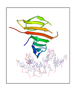 These views are prepared from three orthologuous viewpoints with MolScript. Secondary structures are determined from the C-alpha atom positions of your protein (N-terminal blue, C-terminal red).