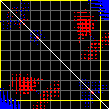 This matrix displays the maximum distance fluctuations between all pairs of CA atoms and between the two extreme conformations that were computed for this mode (DQMIN/DQMAX). Distance increases are plotted in blue and decreases in red for the strongest 10% of the residue pair distance changes. Every pixel corresponds to a single residue. Grey lines are drawn every 10 residues, yellow lines every 100 residues (counting from the upper left corner).