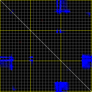 This matrix displays the maximum distance fluctuations between all pairs of CA atoms and between the two extreme conformations that were computed for this mode (DQMIN/DQMAX). Distance increases are plotted in blue and decreases in red for the strongest 10% of the residue pair distance changes. Every pixel corresponds to a single residue. Grey lines are drawn every 10 residues, yellow lines every 100 residues (counting from the upper left corner).