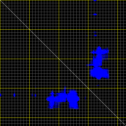 This matrix displays the maximum distance fluctuations between all pairs of CA atoms and between the two extreme conformations that were computed for this mode (DQMIN/DQMAX). Distance increases are plotted in blue and decreases in red for the strongest 10% of the residue pair distance changes. Every pixel corresponds to a single residue. Grey lines are drawn every 10 residues, yellow lines every 100 residues (counting from the upper left corner).