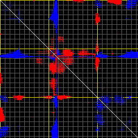 This matrix displays the maximum distance fluctuations between all pairs of CA atoms and between the two extreme conformations that were computed for this mode (DQMIN/DQMAX). Distance increases are plotted in blue and decreases in red for the strongest 10% of the residue pair distance changes. Every pixel corresponds to a single residue. Grey lines are drawn every 10 residues, yellow lines every 100 residues (counting from the upper left corner).
