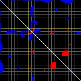 This matrix displays the maximum distance fluctuations between all pairs of CA atoms and between the two extreme conformations that were computed for this mode (DQMIN/DQMAX). Distance increases are plotted in blue and decreases in red for the strongest 10% of the residue pair distance changes. Every pixel corresponds to a single residue. Grey lines are drawn every 10 residues, yellow lines every 100 residues (counting from the upper left corner).