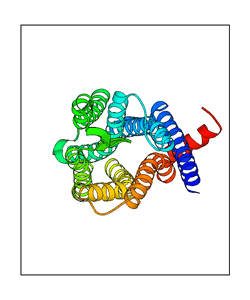 These views are prepared from three orthologuous viewpoints with MolScript. Secondary structures are determined from the C-alpha atom positions of your protein (N-terminal blue, C-terminal red).