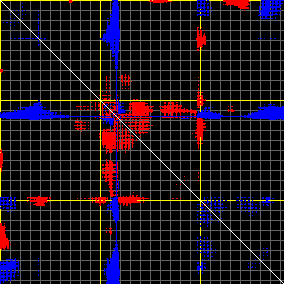 This matrix displays the maximum distance fluctuations between all pairs of CA atoms and between the two extreme conformations that were computed for this mode (DQMIN/DQMAX). Distance increases are plotted in blue and decreases in red for the strongest 10% of the residue pair distance changes. Every pixel corresponds to a single residue. Grey lines are drawn every 10 residues, yellow lines every 100 residues (counting from the upper left corner).