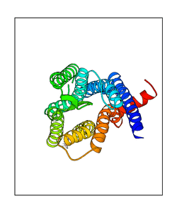 These views are prepared from three orthologuous viewpoints with MolScript. Secondary structures are determined from the C-alpha atom positions of your protein (N-terminal blue, C-terminal red).