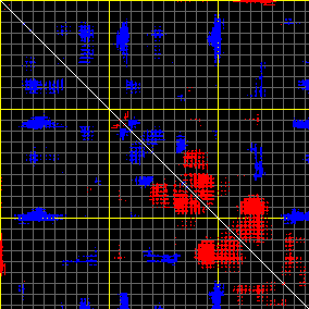 This matrix displays the maximum distance fluctuations between all pairs of CA atoms and between the two extreme conformations that were computed for this mode (DQMIN/DQMAX). Distance increases are plotted in blue and decreases in red for the strongest 10% of the residue pair distance changes. Every pixel corresponds to a single residue. Grey lines are drawn every 10 residues, yellow lines every 100 residues (counting from the upper left corner).