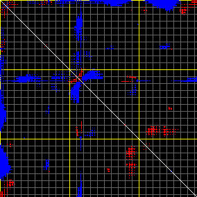 This matrix displays the maximum distance fluctuations between all pairs of CA atoms and between the two extreme conformations that were computed for this mode (DQMIN/DQMAX). Distance increases are plotted in blue and decreases in red for the strongest 10% of the residue pair distance changes. Every pixel corresponds to a single residue. Grey lines are drawn every 10 residues, yellow lines every 100 residues (counting from the upper left corner).