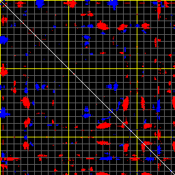 This matrix displays the maximum distance fluctuations between all pairs of CA atoms and between the two extreme conformations that were computed for this mode (DQMIN/DQMAX). Distance increases are plotted in blue and decreases in red for the strongest 10% of the residue pair distance changes. Every pixel corresponds to a single residue. Grey lines are drawn every 10 residues, yellow lines every 100 residues (counting from the upper left corner).