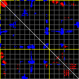 This matrix displays the maximum distance fluctuations between all pairs of CA atoms and between the two extreme conformations that were computed for this mode (DQMIN/DQMAX). Distance increases are plotted in blue and decreases in red for the strongest 10% of the residue pair distance changes. Every pixel corresponds to a single residue. Grey lines are drawn every 10 residues, yellow lines every 100 residues (counting from the upper left corner).