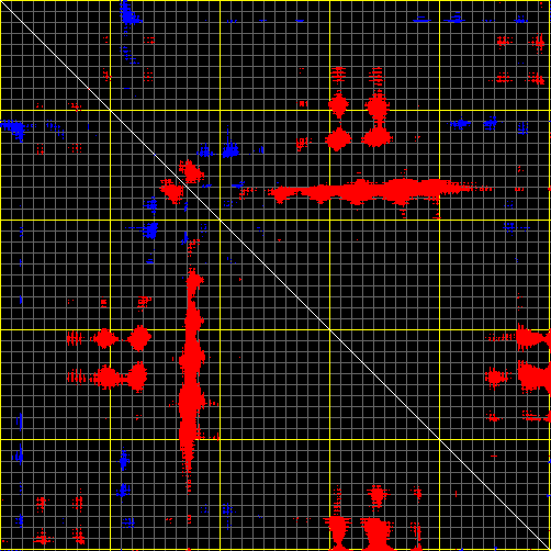 This matrix displays the maximum distance fluctuations between all pairs of CA atoms and between the two extreme conformations that were computed for this mode (DQMIN/DQMAX). Distance increases are plotted in blue and decreases in red for the strongest 10% of the residue pair distance changes. Every pixel corresponds to a single residue. Grey lines are drawn every 10 residues, yellow lines every 100 residues (counting from the upper left corner).