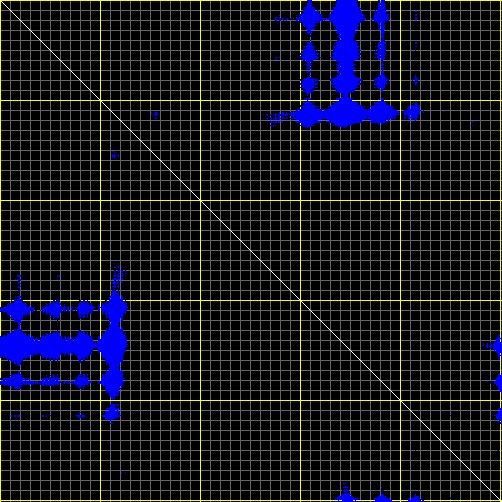 This matrix displays the maximum distance fluctuations between all pairs of CA atoms and between the two extreme conformations that were computed for this mode (DQMIN/DQMAX). Distance increases are plotted in blue and decreases in red for the strongest 10% of the residue pair distance changes. Every pixel corresponds to a single residue. Grey lines are drawn every 10 residues, yellow lines every 100 residues (counting from the upper left corner).