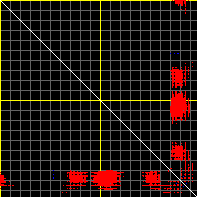 This matrix displays the maximum distance fluctuations between all pairs of CA atoms and between the two extreme conformations that were computed for this mode (DQMIN/DQMAX). Distance increases are plotted in blue and decreases in red for the strongest 10% of the residue pair distance changes. Every pixel corresponds to a single residue. Grey lines are drawn every 10 residues, yellow lines every 100 residues (counting from the upper left corner).
