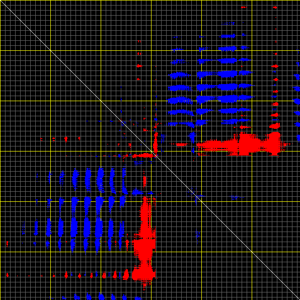 This matrix displays the maximum distance fluctuations between all pairs of CA atoms and between the two extreme conformations that were computed for this mode (DQMIN/DQMAX). Distance increases are plotted in blue and decreases in red for the strongest 10% of the residue pair distance changes. Every pixel corresponds to a single residue. Grey lines are drawn every 10 residues, yellow lines every 100 residues (counting from the upper left corner).