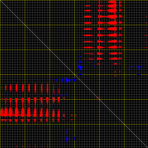 This matrix displays the maximum distance fluctuations between all pairs of CA atoms and between the two extreme conformations that were computed for this mode (DQMIN/DQMAX). Distance increases are plotted in blue and decreases in red for the strongest 10% of the residue pair distance changes. Every pixel corresponds to a single residue. Grey lines are drawn every 10 residues, yellow lines every 100 residues (counting from the upper left corner).