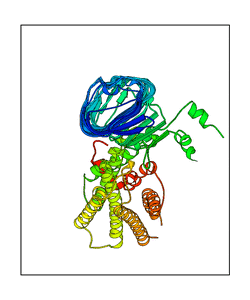 These views are prepared from three orthologuous viewpoints with MolScript. Secondary structures are determined from the C-alpha atom positions of your protein (N-terminal blue, C-terminal red).