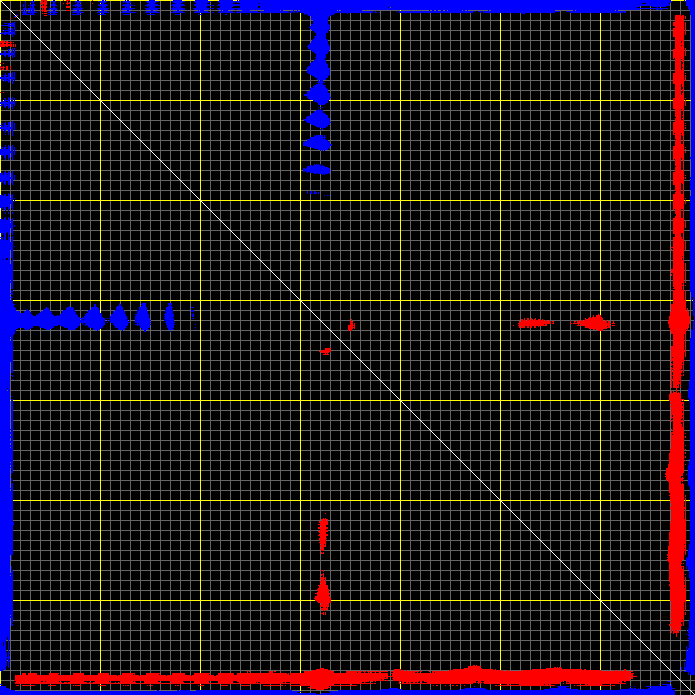 This matrix displays the maximum distance fluctuations between all pairs of CA atoms and between the two extreme conformations that were computed for this mode (DQMIN/DQMAX). Distance increases are plotted in blue and decreases in red for the strongest 10% of the residue pair distance changes. Every pixel corresponds to a single residue. Grey lines are drawn every 10 residues, yellow lines every 100 residues (counting from the upper left corner).