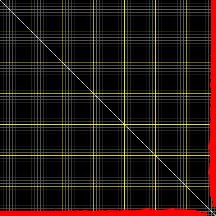 This matrix displays the maximum distance fluctuations between all pairs of CA atoms and between the two extreme conformations that were computed for this mode (DQMIN/DQMAX). Distance increases are plotted in blue and decreases in red for the strongest 10% of the residue pair distance changes. Every pixel corresponds to a single residue. Grey lines are drawn every 10 residues, yellow lines every 100 residues (counting from the upper left corner).
