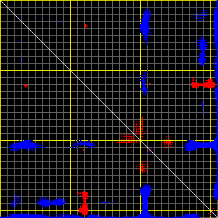 This matrix displays the maximum distance fluctuations between all pairs of CA atoms and between the two extreme conformations that were computed for this mode (DQMIN/DQMAX). Distance increases are plotted in blue and decreases in red for the strongest 10% of the residue pair distance changes. Every pixel corresponds to a single residue. Grey lines are drawn every 10 residues, yellow lines every 100 residues (counting from the upper left corner).