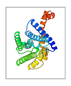 These views are prepared from three orthologuous viewpoints with MolScript. Secondary structures are determined from the C-alpha atom positions of your protein (N-terminal blue, C-terminal red).