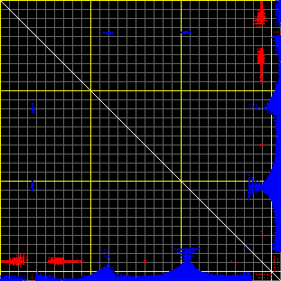 This matrix displays the maximum distance fluctuations between all pairs of CA atoms and between the two extreme conformations that were computed for this mode (DQMIN/DQMAX). Distance increases are plotted in blue and decreases in red for the strongest 10% of the residue pair distance changes. Every pixel corresponds to a single residue. Grey lines are drawn every 10 residues, yellow lines every 100 residues (counting from the upper left corner).