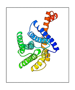 These views are prepared from three orthologuous viewpoints with MolScript. Secondary structures are determined from the C-alpha atom positions of your protein (N-terminal blue, C-terminal red).
