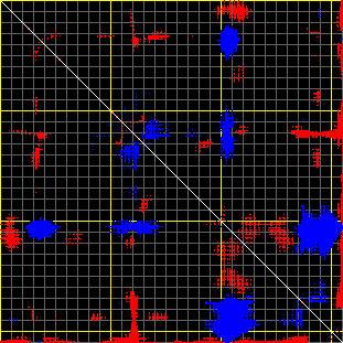 This matrix displays the maximum distance fluctuations between all pairs of CA atoms and between the two extreme conformations that were computed for this mode (DQMIN/DQMAX). Distance increases are plotted in blue and decreases in red for the strongest 10% of the residue pair distance changes. Every pixel corresponds to a single residue. Grey lines are drawn every 10 residues, yellow lines every 100 residues (counting from the upper left corner).