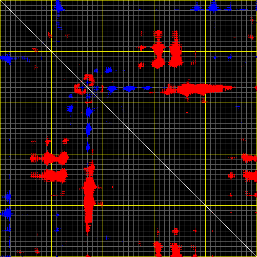 This matrix displays the maximum distance fluctuations between all pairs of CA atoms and between the two extreme conformations that were computed for this mode (DQMIN/DQMAX). Distance increases are plotted in blue and decreases in red for the strongest 10% of the residue pair distance changes. Every pixel corresponds to a single residue. Grey lines are drawn every 10 residues, yellow lines every 100 residues (counting from the upper left corner).